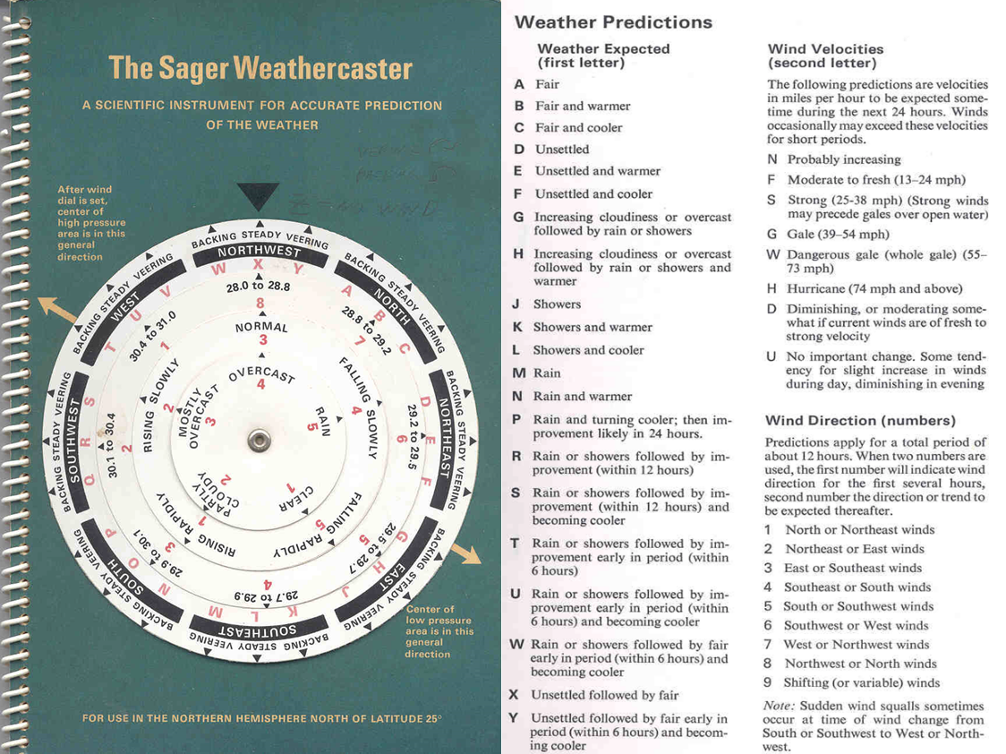 Sager Weathercaster ennustaa sään nopeasti ja tarkasti. Se on ollut käytössä vuodesta 1942. Se ei ole uutuus, ei lelu, se on erittäin luotettava, tieteellisesti suunniteltu työkalu, joka on korvaamaton apuväline matkailijoille, maanviljelijöille, metsästäjille, merimiehille, purjehtijoille, leiriläisille, kalastajille, opiskelijoille - itse asiassa kaikille jotka tarvitsevat tai haluavat tietää millainen sää on tulossa. Sen avulla voit tehdä ennusteita säästä, lämpötilasta ja tuulesta välittömästi noin 50 km säteelle sijainnistasi, joten se täyttää erittäin kiireellisetkin tarpeet. Sager Weathercaster on säätieteeseen perustuva väline. Se on itse asiassa kätevä tietokone, joka käyttää helposti havaittavia sääolosuhteita ja ohjelmoitu tuottamaan ytimekkäitä ennusteita, jotka perustuvat viidentuhannen syötetiedon vaihteluun. Se ilmentää kokemusta, joka on saatu yli 35 vuoden ennusteista yksityisille yrityksille ja Yhdysvaltojen ilmavoimille. Sager Weathercasterin ja tässä selitetyn barometrin oikean havainnon avulla voit tehdä tarkkoja ja ajantasaisia ennusteita nopeasti muuttuvissa olosuhteissa tarkalleen sijainnillesi. Suurin tarkkuus saadaan tietysti tekemällä ennusteita säännöllisin väliajoin. Tämä on avoimen koodin algoritmi. ![]() BT's Global Sager Weathercaster PHP Scripts For CumulusMX |